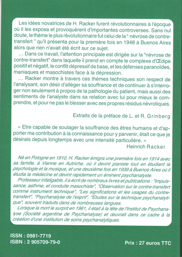 H. Racker eut des idées novatrices et révolutionnaires à l’époque où il les exposa, et en particulier, celle de la “névrose de contre-transfert”.
