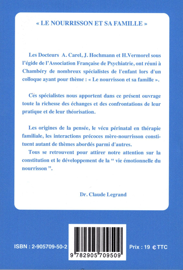 Le nourrisson et sa famille - Sous la direction de A. Carel, J. Hochmann et H. Vermorel - Livre collectif / / / - Origine de la pensée, - Vécu périnatal en thérapie familiale, - Maternalité psychotique, - Interactions précoces mère-nourrisson … sont quelques uns des thèmes abordés par les auteurs —français et suisses— du colloque de Chambéry sous l’égide de l’Association Française de Psychiatrie. / 15 cm x 21,5 cm - 216 p. - isbn : 2-905709-50-2
