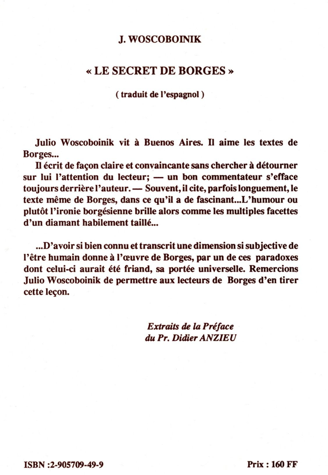 Le secret de Borgès de Julio Woscoboinik / Préface du Pr Didier Anzieu / Traduit de l'espagnol / D’avoir si bien connu et transcrit une dimension si subjective de l’être humain, donne à l’œuvre de Borgès, par un de ces paradoxes dont celui-ci aurait été friand, sa portée universelle. Sous la plume de l’auteur à l’écriture claire et convaincante, l’humour ou plutôt l’ironie borgésienne brille comme de multiples facettes d’un diamant habilement taillé... Extraits de la préface / 15 cm x 21,5 cm - 264 p. - isbn : 2-905709-49-9