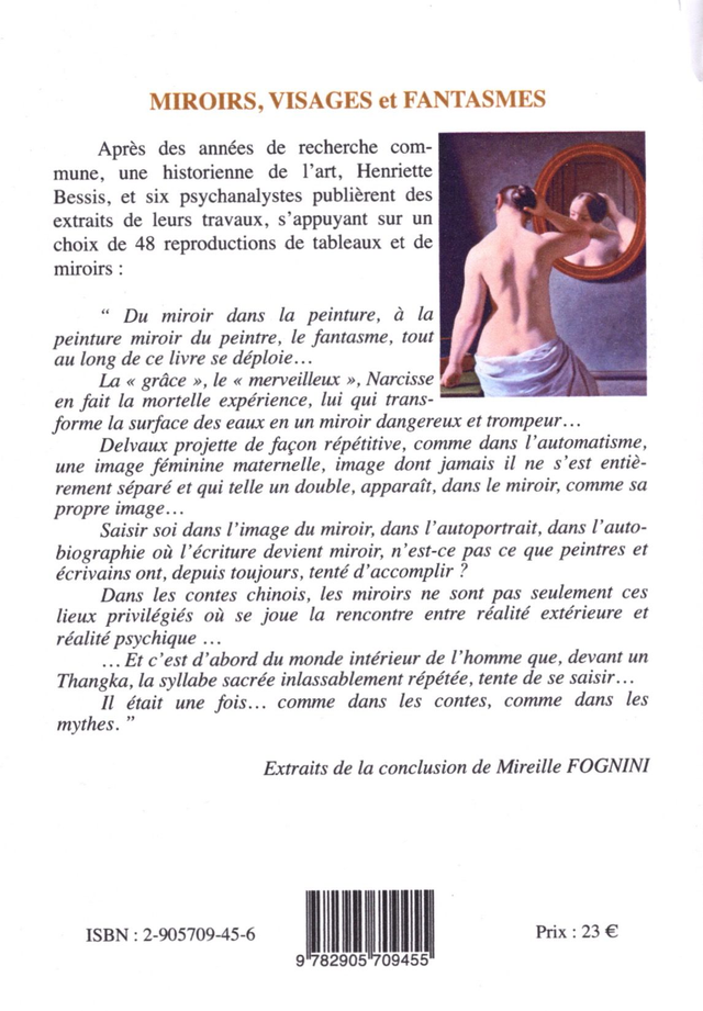 Miroirs, visages et fantasmes de H. Bessis, A. Clancier, M. Fognini, A. Gutmann… / / deuxième édition revue et augmentée / / Miroirs et fantasmes dans l'œuvre de Delvaux, Narcisse chez Poussin, Henri-Frédéric Amiel et son double, Des jumeaux pour une image… sont quelques-uns des titres de chapitres de cet ouvrage illustré en COULEUR, de plus de cinquante tableaux sur le thème du miroir. Contributions de : H. Bessis, A. Clancier, J. Cophignon, M. Fognini, J. Gorot, A. Gutmann, S. Panzera-Flamand. / 15 cm x 21,5 cm - 226 p. - isbn : 2-905709-23-5