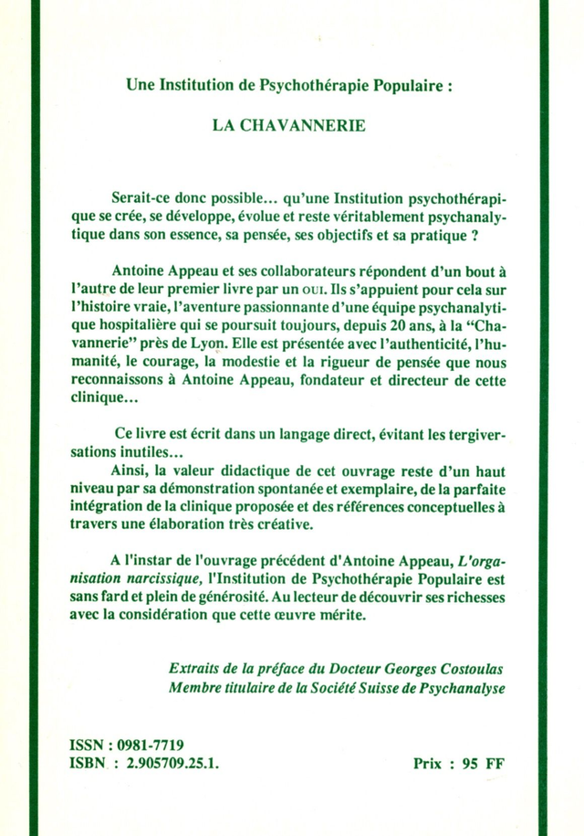 Une institution de psychothérapie populaire : La Chavannerie -tome 1- A. Appeau, P. Brunand, Cl. Legrand / Préface du Dr G. Costoulas / Voici l’aventure passionnante de l’équipe psychanalytique qui a travaillé pendant plus de 30 ans à “La Chavannerie” près de Lyon. Ce premier tome présente l’histoire de cette clinique psychiatrique, son organisation, le travail des petits groupes et des groupes larges. / 15 cm x 21,5 cm - 160 p. - isbn : 2-905709-25-1