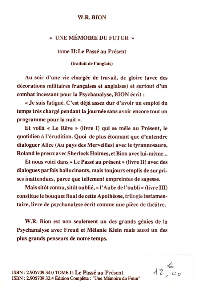 Une Mémoire du Futur Tome II : Le passé au présent de W.R. Bion / Bion est non seulement un des grands génies de la Psychanalyse avec Freud et M. Klein, mais aussi un des plus grands penseurs de notre temps. Une mémoire du futur, livre de psychanalyse écrit comme une pièce de théâtre, avec des dialogues parfois hallucinants, mais toujours emplis de surprises inattendues, parce que tellement empreintes de sagesse, représente sa trilogie testamentaire. / 15 cm x 21,5 cm - 220 p. - isbn : 2-905709-34-0
