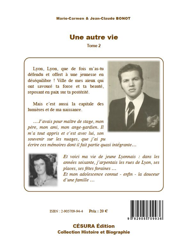 Une autre vie -Tome II- de M.-C. & J.-Cl. Bonot / / « Les maisons d'en haut » sont ce petit village d'Ordonnaz flanqué dans les montagnes de l'Ain. Mon enfance a musardé sur ces plaines, ces bois, ces collines. Dans cette autobiographie, ma mémoire s'est envolée comme une nuée de papillons pour vous raconter mes jeunes années à la campagne. J'ai poussé dans son histoire comme ont poussé les chardons de là-bas. Ce livre est authentique. Son patois, ses situations sont restés tels que je les ai laissés en ce temps-là. Avec ce livre, je veux vous transporter dans des moments bucoliques parfois rieurs, souvent tristes, mais avant tout empreints de vérité. J'avais envie certainement de partager avec les lecteurs afin qu'ils tracent avec moi, les labours de ma vie paysanne. D'autres livres poursuivront cette épopée primesautière qui m'a laissé des bleus à l'âme mais aussi un amour inconditionnel pour la nature. / / T.2 : 18 cm x 24 cm - 342 p. - isbn : 2-905709-93-6